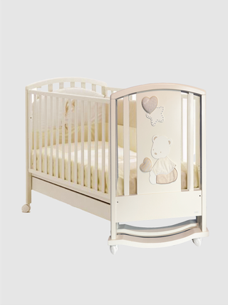 Lettino MIBB modello Orsetto, in condizioni eccellenti. - Struttura robusta in legno laccato panna, con sponde sicure e pannello centrale imbottito con applicazioni orsetto e cuori. - design neutro adatto sia a maschietto che a femminuccia. - Dotato di ruote con freno per una facile movimentazione. - Materasso e Cuscino Paracolpi incluso