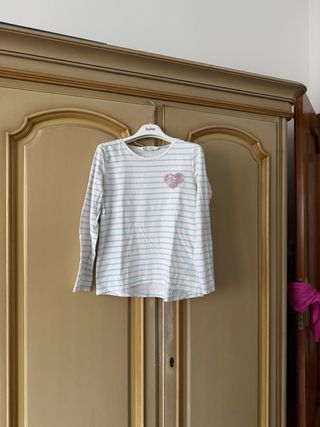 Maglietta a maniche lunghe per bambina H&M, a righe bianche e azzurre, con un cuore glitterato sul petto. - Taglia 8-10 anni. - Composizione: 100% cotone.