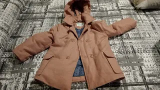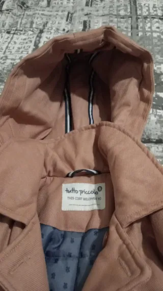 Cappotto nuovo per bambina o bambino, taglia 4 anni. Colore rosa tenue, con cappuccio e chiusura a bottoni. - Fodera interna blu a pois. - Tasche frontali. - Design classico.