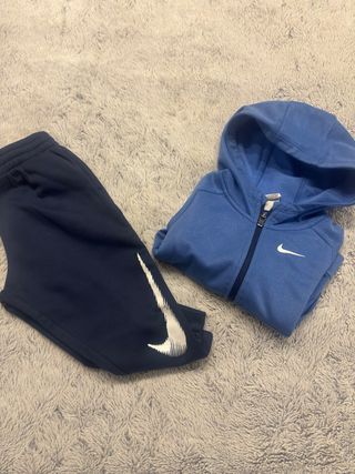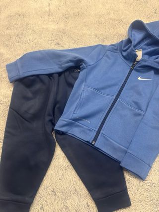 Completo tuta Nike per bambino di 36 mesi. - Felpa con cappuccio blu. - Pantaloni blu scuro. - Logo Nike bianco sui pantaloni e sulla felpa.