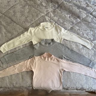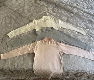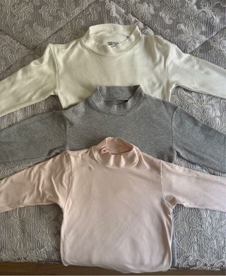 Set di tre maglie a collo alto con maniche lunghe, in colori neutri ed eleganti. - Un capo bianco panna. - Un capo grigio melange. - Un capo rosa cipria. - Nb. 2 maglie ci sono delle piccole macchie