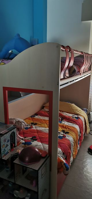 Cameretta componibile con finitura rovere azzurro e rosso: Letto castello piu uno scomparto con terzo letto, scrivania 150cm con mobiluccio a 3 cassetti con ruote , piu armadio angolare, set di 7 cassetti con ruote, completo di materassi memory