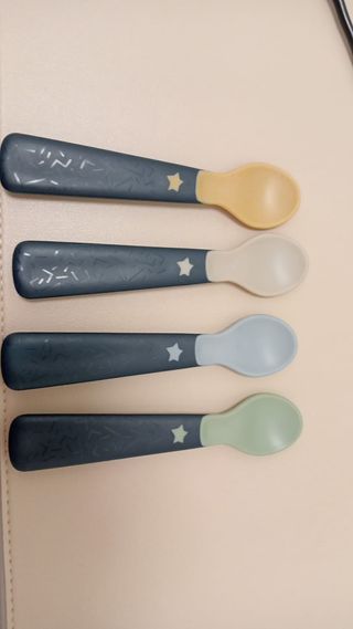 Set di 4 cucchiaini per la pappa dei neonati. Sono nuovi e mai utilizzati. - Colori assortiti: giallo, beige, azzurro e verde menta. - Manico blu scuro con fantasia di stelline. - Ideali per l'inizio dello svezzamento.