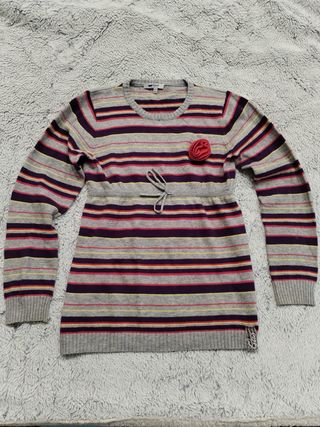 Vestitino a righe per bambina. - Fantasia a righe colorate. - Dettaglio fiore applicato sul petto. - Coulisse in vita. - Composizione: 50% lana, 50% cotone.