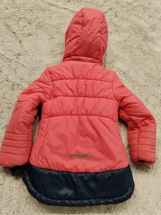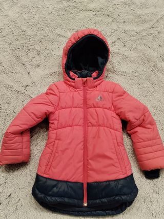 Giubbotto imbottito Adidas per bambina, taglia 5/6 anni. Colore rosa con dettagli blu scuro. - Cappuccio integrato. - Chiusura con zip frontale. - Logo Adidas sul petto.