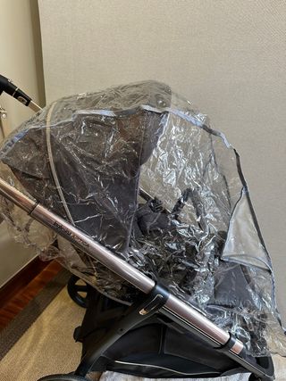 Protettore antipioggia trasparente per il passeggino della marca Inglesina. È un accessorio pratico per proteggere il bambino.