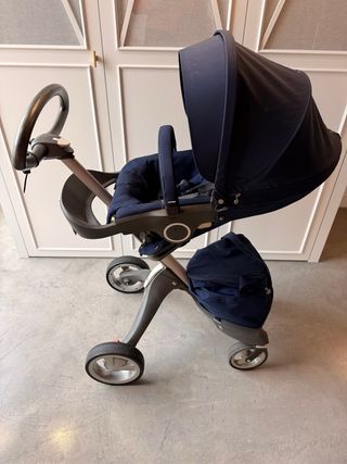 Passeggino Stokke Xplory in blu navy. Un design elegante e funzionale per gli spostamenti. Include: seggiolino auto, navicella e marsupio. Tetto estensibile, intercambiabile per la navicella. Manubrio regolabile. Cestino portaoggetti. Ruote tuttoterreno. Consegna con protezione in pique su misura. Vendita intera o separata (chiedere).