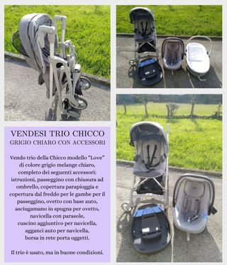 Vendo trio Chicco modello Love in colore grigio melange chiaro, completo di accessori. - Istruzioni - Passeggino con chiusura ad ombrello - Copertura parapioggia e copertura freddo per passeggino - Ovetto con base auto - Asciugamano in spugna per ovetto - Navicella con parasole - Cuscino aggiuntivo per navicella - Agganci auto per navicella - Borsa in rete porta oggetti. Il trio è usato, ma in buone condizioni.