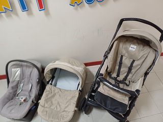 Modello Trio Inglesina Trilogy. Culla, passeggino e seggiolino auto gruppo 0; tutti possono essere posizionati faccia e schiena durante gli spostamenti. Borsa per pannolini e borsa antipioggia in plastica (culla e passeggino). Ottime condizioni, ruote usurate dall'uso.