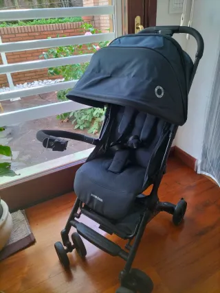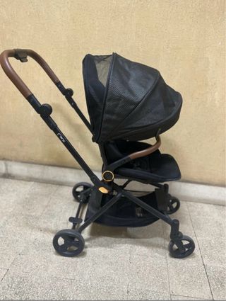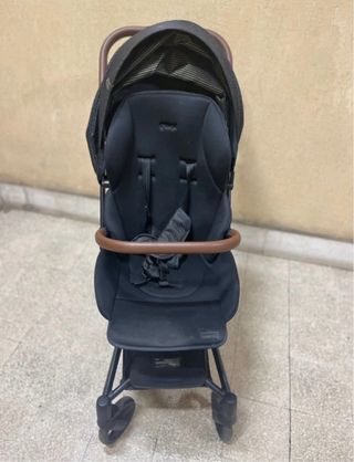 Passeggino leggero Momi Adelle, ideale per spostamenti agili. Usato ma in ottime condizioni, pieghevole con seduta a 360. Peso massimo 22 kg - Colore nero. - Telaio con finitura color legno. - Cappottina parasole.