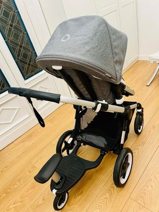 Passeggino Bugaboo Fox in color grigio melange, completo di navicella. Bugaboo Fox in vendita, in ottime condizioni, completo di numerosi accessori. Include: navicella, copertura antipioggia, pedana per il secondo bambino, due fodere per il sedile (una estiva del marchio BCN e una invernale imbottita in velluto del marchio Millar). Carrozzina comoda, robusta e facile da manovrare, ideale fin dalla nascita. - Tessuto grigio melange. - Navicella inclusa.