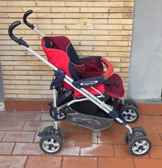 Vendo silla de paseo gemelar Maclaren Quest de color rojo. Está en buenas condiciones, aunque presenta algunos signos de uso. - Se pliega fácilmente. - Incluye dos capotas. - Tejido rojo. - Chasis plateado. Incluye plastico original maclaren para la lluvia