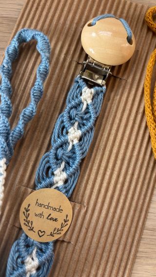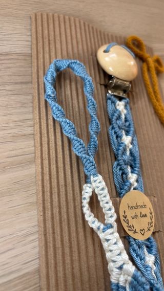 Laccio porta ciuccio realizzato a mano con cura. - Personalizzabile nel colore - Realizzato con filato di cotone. - Design intrecciato con fili azzurri e bianchi. - Clip in legno per agganciare il ciuccio. - Etichetta handmade with love inclusa.