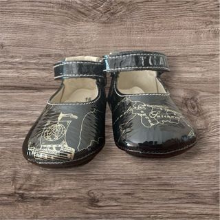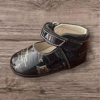 Scarpette da bambina in vernice nera con un simpatico disegno di una mappa. - Taglia 16. - Chiusura con velcro. - Fodera interna in pelle. Difetto: -scritta sbiadita ma leggibile
