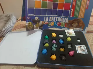 Gioco da tavolo La Battaglia dei Colori completo, con tutti i personaggi e 4 carte - Include personaggi dei film Shrek, Madagascar e Home. - Scatola metallica con inserto in schiuma per riporre i pezzi. - Tabellone con griglia colorata.