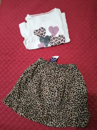 Set composto da gonna Zara e T-shirt primark, entrambe taglia 10 anni. - Gonna con stampa animalier e volant nuova con cartellino. - T-shirt bianca con cuori glitterati e stampa leopardata da abbinare alla gonna. Piccoli segnetti evidenziati in foto ma la maglia è ancora perfetta da utilizzare sotto la gonna o a scuola sotto il grembiule.