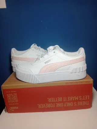 Scarpe Puma Carina Lift in colore bianco con dettagli rosa. La suola è rialzata per un look moderno. NUOVE Senza box Misura 33 - Striscia Puma sul lato. - Chiusura con lacci.