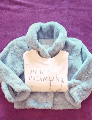 Set composto da un morbido pellicciotto azzurro e una maglietta. - Pellicciotto Original Marines di colore celeste polvere,con colletto ampio,chiusura con bottoni automatici. Misura 5/6 Years. - Maglietta a maniche lunghe molto morbida,in ciniglia con stampa Off to Dreamland e stelline. Misura 6/7 Years