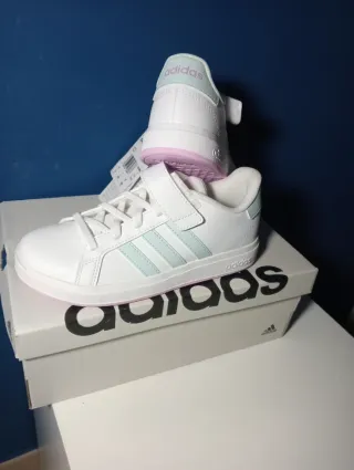 Scarpe Adidas Grand Court 2.0 per bambina, perfette per il tempo libero. Nuove con cartellino e scatola, misura 33 - Colore bianco con dettagli azzurri e rosa. - Chiusura a strappo. - Logo Adidas sul lato e sul tallone.