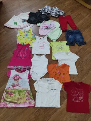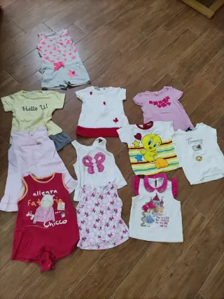 Set estivo per neonata di 12 mesi. - Completo composto da: 5 paia di magliette a maniche corte; 4 smanicati; 1 pigiama; 3 minigonne; 1 vestitino intero; 1 pinocchietto. Tutti in buone condizioni