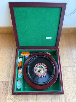 Set da gioco per la roulette completo di ruota e fiches. - Ruota da roulette in legno scuro. - Vassoio interno in feltro verde. - Fiches colorate di diverse tonalità. - Panno Verde