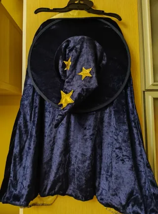 Costume da mago blu con dettagli dorati, taglia unica. Perfetto per feste a tema o giochi di ruolo. - Mantello blu in velluto. - Fodera interna color oro. - Stelle dorate applicate sul mantello. - Collo alto dorato. - Bacchetta inclusa
