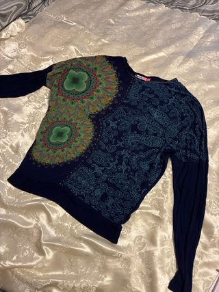 Maglia Desigual per ragazza, taglia 13/14 anni. Presenta un design colorato e vivace. - Maniche lunghe. - Fantasia mandala e paisley. - Colori predominanti blu, verde e arancione.