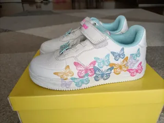 Scarpe da ginnastica bianche per bambina, decorate con tante farfalle colorate.Indossate una volta sola. - Chiusura a velcro. - Dettagli glitter. - Fodera interna azzurra.