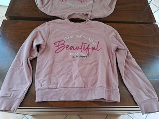 3 magliette 12 anni maniche lunghe: bianca con fiori e a righe Okaïdi, rosa kiabi. La maglietta a righe non ha più lo sticker sul cuore visibile nelle foto.