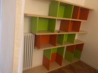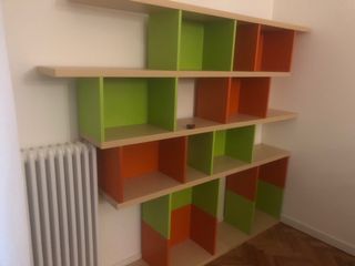 Moderna libreria componibile con vani colorati. - Struttura in legno chiaro. - Vani interni in verde e arancione. - Design asimmetrico.