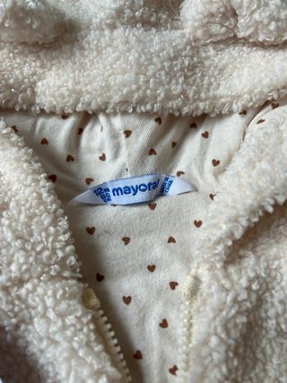 Morbidissimo e adorabile giubbottino teddy Mayoral per bebè, perfetto per la stagione autunno/inverno. Realizzato in tessuto effetto orsetto, è caldo, soffice e avvolgente, ideale per tenere il bimbo al caldo nelle giornate più fresche. Dotato di cappuccio per una maggiore protezione e chiusura con zip, pratica e veloce. Il colore neutro e delicato lo rende facilissimo da abbinare a qualsiasi outfit, sia casual che più curato. Interno rifinito con fantasia delicata, tipica della qualità Mayoral. ✔️ Marca: Mayoral ✔️ Taglia: 12 mesi / 80 cm ✔️ Tessuto: teddy / effetto orsetto