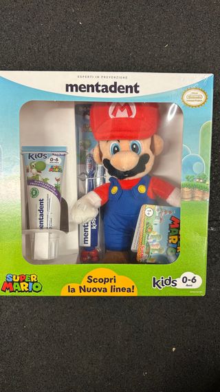 Set Mentadent Kids con peluche di Super Mario. - Peluche di Super Mario. - Dentifricio Mentadent Kids 0-6 anni gusto frutta. - Spazzolino da denti Mentadent Kids. - Bicchiere.
