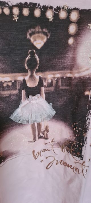 Canotta rosa per bambina, ideale per danza o tempo libero. - Dimensioni: 8/10 anni (controllare misure). - Colore: rosa chiaro. - Stampa glitterata 'Dimensione Danza Sister'. - Ottime condizioni.