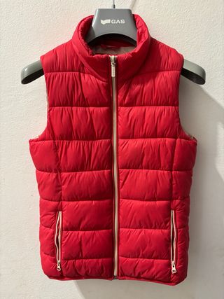 Gilet imbottito rosso per bambina, perfetto per le giornate più fresche. - Chiusura con zip centrale. - Due tasche laterali con zip. - Collo alto.