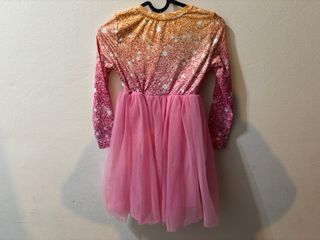 Vestito per bambina con stampa glitterata sfumata dall'arancione al fucsia e gonna in tulle rosa. - Maniche lunghe. - Gonna in tulle. - Stampa glitterata.