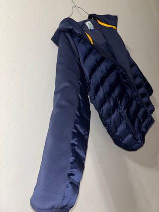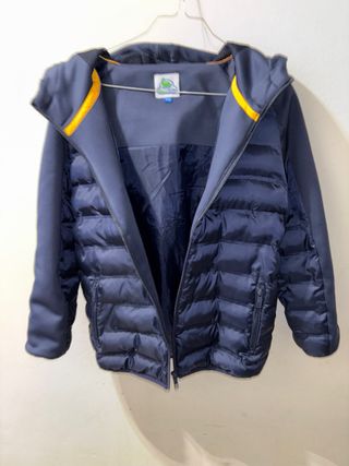 Piumino blu con cappuccio, ideale per ragazzi di 12 anni. Presenta un design moderno e confortevole. - Maniche in tessuto tecnico. - Zip frontale. - Tasche laterali con zip. - Dettagli a contrasto giallo sull'interno del cappuccio.