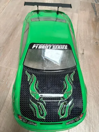 Auto radiocomandato X-Ranger in scala 1/10 con trazione integrale 4WD. La carrozzeria è di colore verde con grafiche a fiamma. Batteria supplementare . - Scala 1/10 - Trazione 4WD - Carrozzeria verde con grafiche