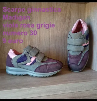 Scarpe da ginnastica Madigan, numero 30. Viola, rosa e grigie, molto comode e facili da indossare con la chiusura a strappo. Ottima vestibilità. Vendo per cambio numero. - Colore viola, rosa e grigio. - Chiusura con velcro.