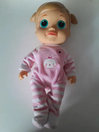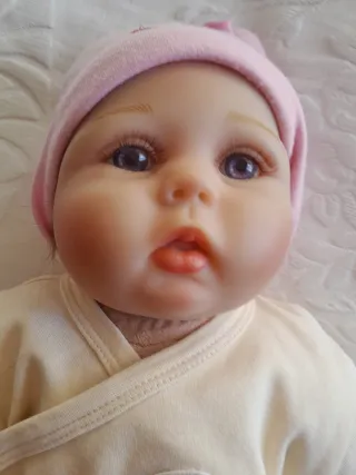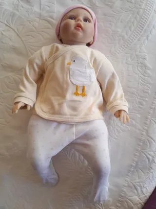 Bambola neonato con un simpatico disegno di un pulcino sulla tutina.I vestiti non sono originali - Cappellino rosa. - Tutina color crema con fantasia a pois. - Piedini integrati nella tutina.