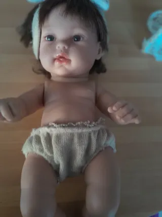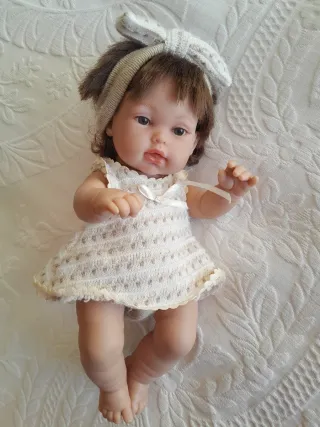 Bambola Arias neonata con dettagli realistici, perfetta per collezionisti o come regalo. - Vestitino in maglia color panna con fiocco. - Fascia per capelli abbinata. - Capelli castani e occhi azzurri.