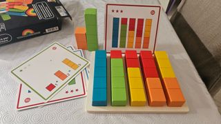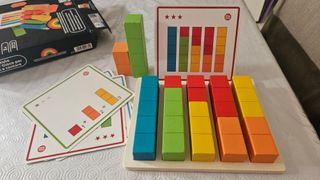 Set di blocchi colorati Playtive per imparare i numeri e le quantità, ispirato al metodo Montessori. Include carte con esercizi. - Blocchi in legno colorati. - Carte con esercizi di matematica. - Stimola la motricità fine e la comprensione dei numeri.