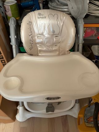Seggiolone Brevi modello Happy Family, ideale per i più piccoli. La seduta è imbottita e confortevole. - Design con simpatici coniglietti. - Rivestimento lavabile. - Vassoio removibile.