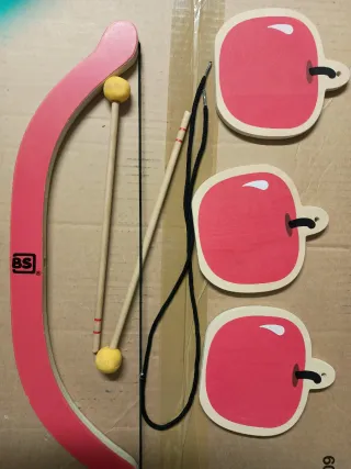 Gioco arco e frecce in legno e completo di bersagli a forma di mela. Ottime condizioni come nuovo