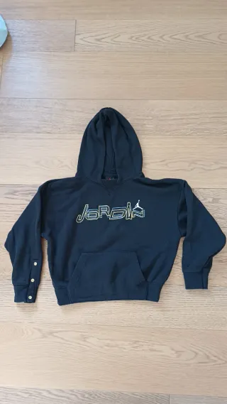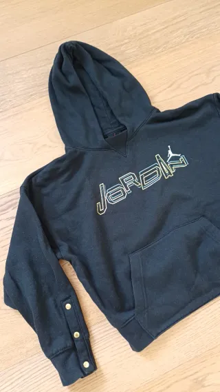 Vendo felpa con cappuccio del celebre marchio JORDAN, un capo sportivo e iconico per bambina. Questa felpa è un modello cropped (taglio corto) molto attuale ed è ideale per completare un look streetwear. È nera con una stampa colorata del logo JORDAN sul petto e una comoda tasca a marsupio. Un dettaglio di stile sono i bottoni decorativi sui polsini. Taglia: M (Medium) Bambina (128-140 cm) Condizioni: Buone condizioni. Presenta normali segni d'uso, ma è strutturalmente integra. Misure: Lunghezza: 44 cm Torace (da ascella ad ascella): 51 cm Spalle: 53 cm Un capo di marca sempre attuale, pronto per essere indossato!