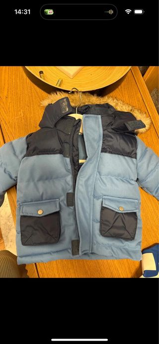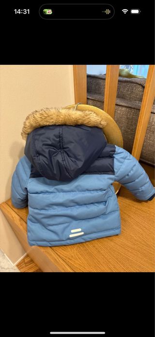 Calda giacca invernale per neonato, perfetta per le giornate fredde. mai indossata - Colore blu e blu scuro. - Cappuccio con pelliccia sintetica. - Imbottitura spessa per un ottimo isolamento termico. - Dettagli riflettenti sulla parte posteriore.