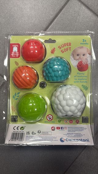 Set di 5 palline sensoriali Clementoni per neonati. - Età consigliata: 3+ mesi. - Morbide e sicure. - Lavabili al 100%. - Senza muffa. - Sviluppo sensoriale.