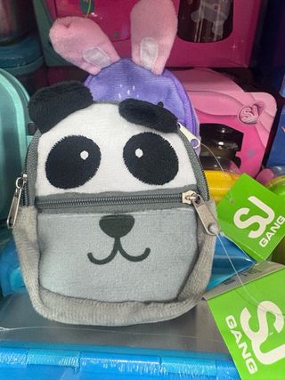set portachiave zaino Graziosa borsetta in peluche a forma di animali. Perfetta per i più piccoli. - Borsetta a forma di coniglio viola con orecchie rosa. - Borsetta a forma di panda grigio e bianco. - Materiale morbido al tatto.