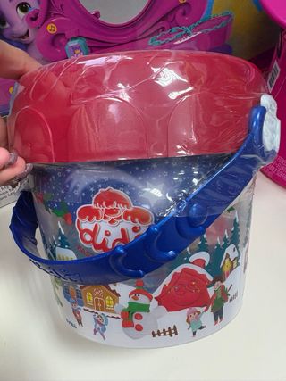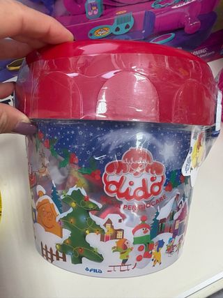 Contenitore a tema natalizio per la pasta da modellare Dido. - Design con Babbo Natale, albero di Natale e pupazzo di neve. - Coperchio rosso. - Marchio Fila.