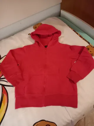 Felpa con cappuccio per bambina, colore rosso vivace e chiusura con zip frontale. Perfetta per un look casual e comodo. Leggerissime macchioline sul dietro come da foto. - Cappuccio integrato. - Tasche anteriori. - Polsini e fondo a costine.