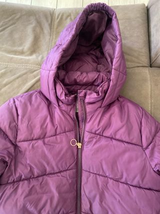 Piumino viola con cappuccio, perfetto per le giornate più fredde. - Chiusura con zip. - Due tasche frontali. - Polsini elasticizzati.